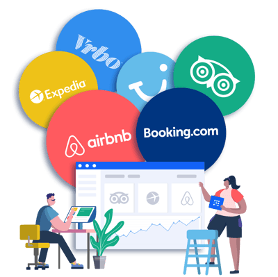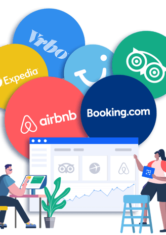 Airbnb, Booking, Expedia, Vrbo, Google Alquiliera vacacionales y otras. Además de nuestra plataforma propia con reservas directas y con sus correspondientes motores de búsqueda.